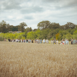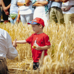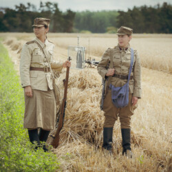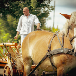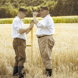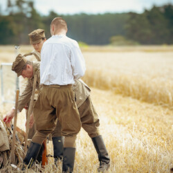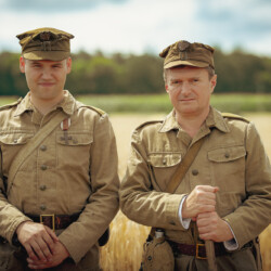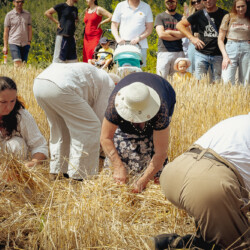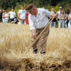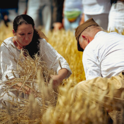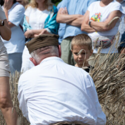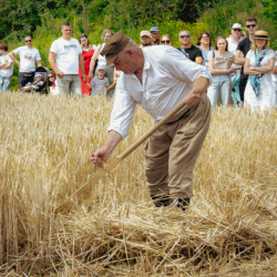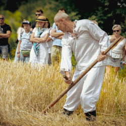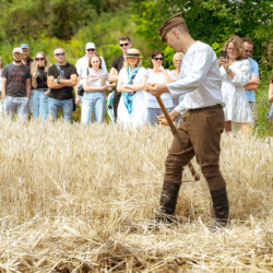 Na muzealnym polu członkowie Stowarzyszenia Rekonstrukcji Historycznej REGA odtworzyli epizody żniwne sprzed ponad 80 lat. Zaprezentowaliśmy tradycyjne prace polowe wykonywane przy użyciu autentycznego sprzętu z epoki, z udziałem rekonstruktorów w historycznych strojach ludowych i wojskowych. Pokazy koszenia kosą i sierpem, wiązania snopów oraz układania ich w mendle przypomniały zwiedzającym trud codziennej pracy rolników w realiach wojennych i w czasie wielkich przemian społecznych.