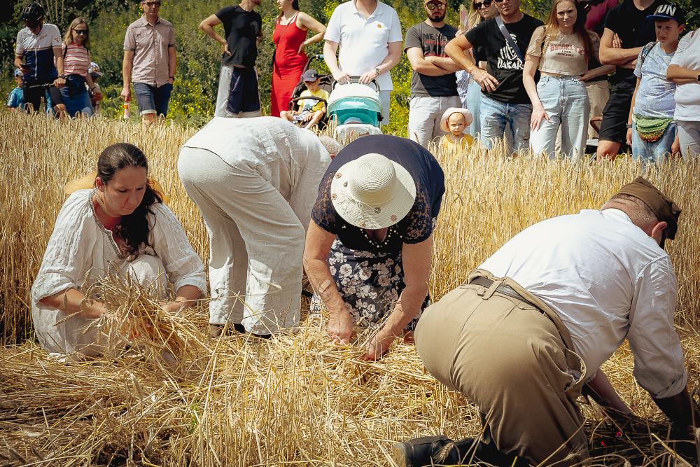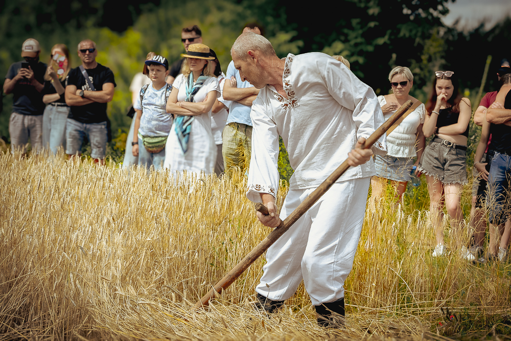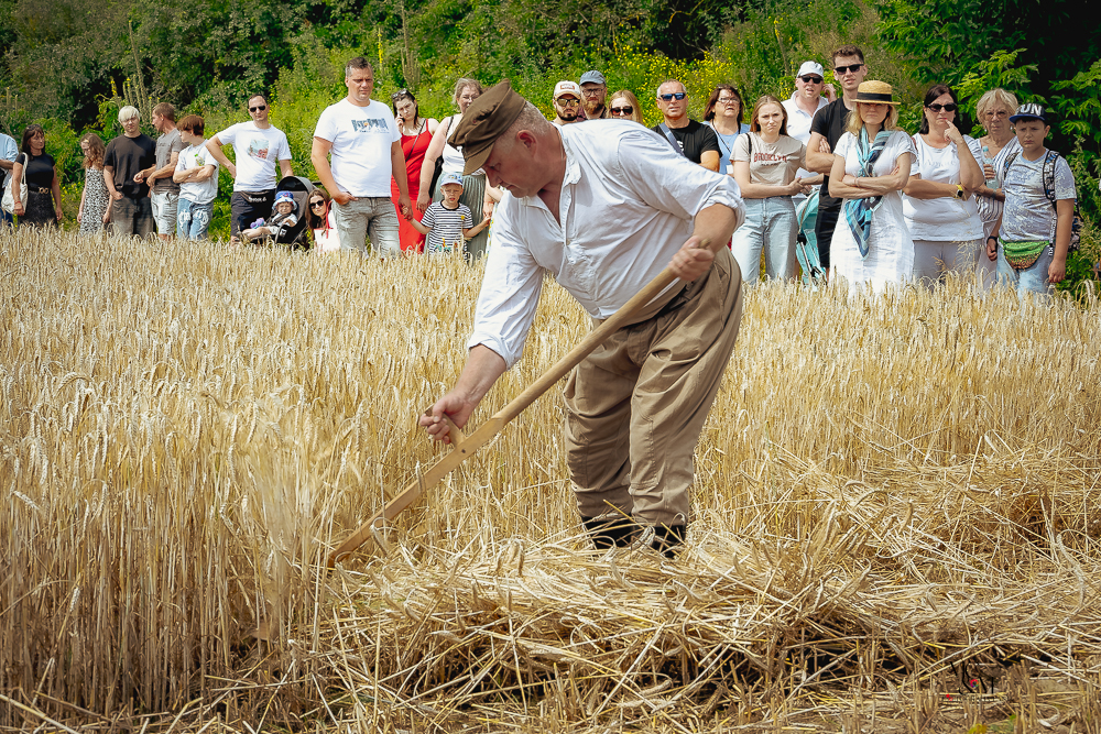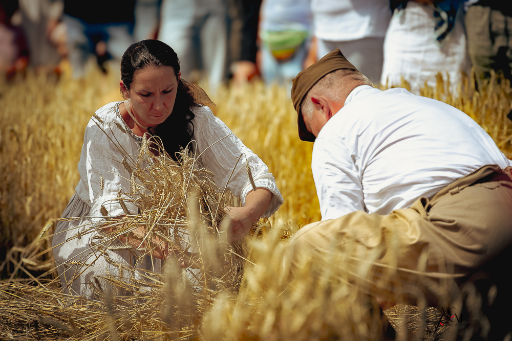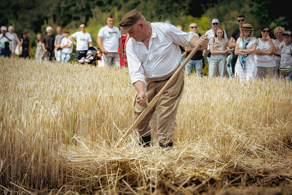 Na muzealnym polu członkowie Stowarzyszenia Rekonstrukcji Historycznej REGA odtworzyli epizody żniwne sprzed ponad 80 lat. Zaprezentowaliśmy tradycyjne prace polowe wykonywane przy użyciu autentycznego sprzętu z epoki, z udziałem rekonstruktorów w historycznych strojach ludowych i wojskowych. Pokazy koszenia kosą i sierpem, wiązania snopów oraz układania ich w mendle przypomniały zwiedzającym trud codziennej pracy rolników w realiach wojennych i w czasie wielkich przemian społecznych.